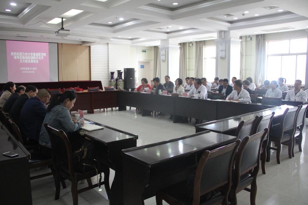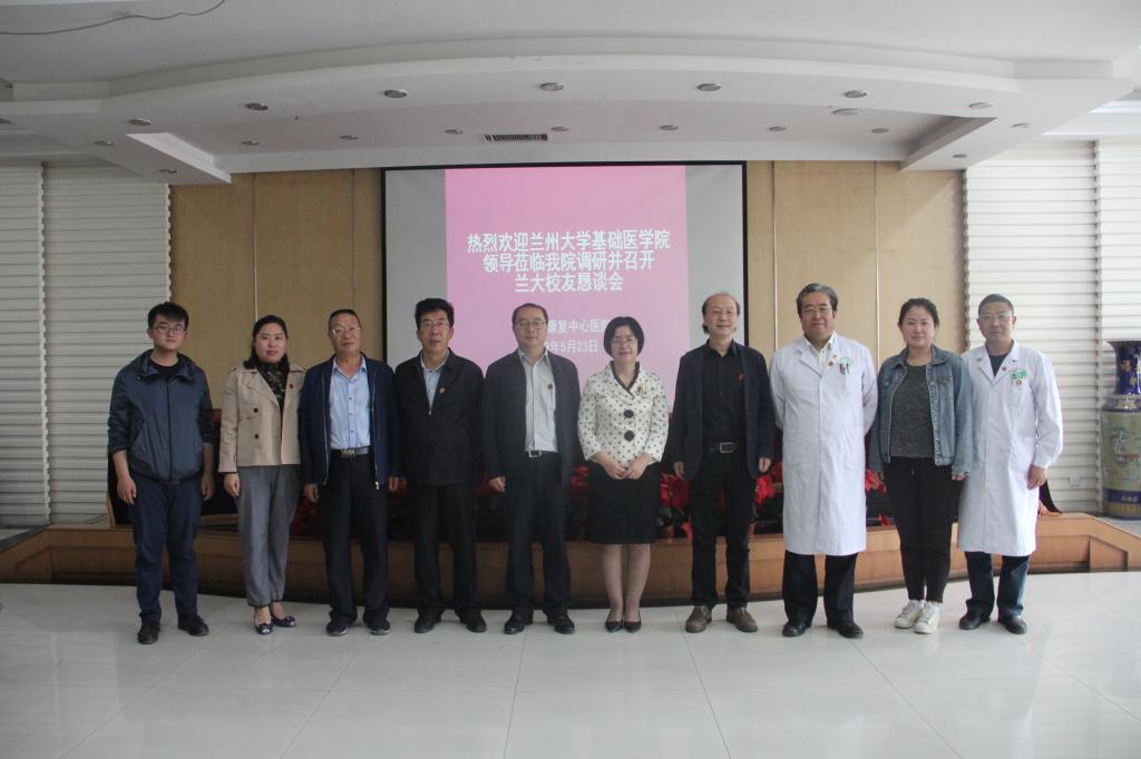 5月23日上午,在兰州大学110周年校庆即将来临之际,兰州大学基础医学院组织开展迎校庆走访调研校友活动。作为活动第一站,学院党委书记郭明宙、副院长宋焱峰、刘学兵、院党委副书记徐争、院办公室主任董志娟、院团委书记李森一行六人首选到省康复中心医院进行调研,并召开兰大校友恳谈会,看望慰问广大校友。省康复中心医院院长石秀娥、常务副院长王登廷、副院长王斌雄及医院各级兰大校友代表30余人参加了恳谈会。