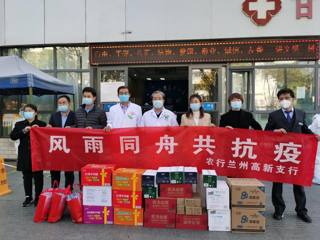 医院负责人王登廷、副院长康宝玉代表医院对农业银行兰州高新支行给予的关心、支持表示衷心的感谢!并表示,一定会凝心聚力、敢于担当,将举全院之力为坚决打赢这场没有硝烟的遭遇战、阻击战作出最大的努力,为呵护广大百姓生命健康安全,砥砺初心、努力前行!同时,也希望能够集结更多爱心企业和爱心人士,共同投入到这场抗击疫情的滚滚洪流中,众志成城,携手并进,共创美好未来!